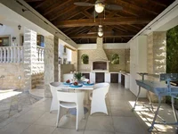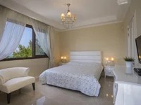 The internal area of this luxurious villa is 435 square meters.Includes 5 bedrooms, two kitchens, 6 bathrooms, bidet, showers, sauna, observation deck on the 3rd floor.Located on territory of 2500 m2 with a covered outdoor veranda "for barbecue" for 14 seats with its own kitchen, refrigerator and barbecue pit. On the lower level of the villa there is a lower deck with cozy secluded areas next to a waterfall, a bridge, a pond with goldfish and a private access to the sea.The villa includes a heated swimming pool with water shower, umbrellas and new comfortable sun loungers – all surrounded by gardens.