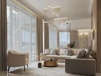 La arquitectura del edificio se distingue por líneas limpias y acabados reflexivos, y el acristalamiento panorámico mejora la conexión entre el interior y el espacio circundante. Los techos altos, un sistema de suelo cálido, el control climático VRV y elementos de una casa inteligente enfatizan un alto nivel de confort.