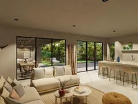 La villa cuenta con una estética elegante y contemporánea con grandes aberturas, maximizando la luz natural y sin costuras interiores.