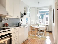 The apartment charms with its original woodplank floors, high ceilings, large windows and deep window sills, which together create a classic, comfortable and homely atmosphere. The windows offer beautiful views of the tranquil courtyard.