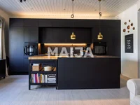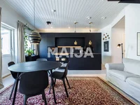 La cocina y la sala de estar forman una zona de estar cómoda y unificada con acceso a la terraza. En la planta baja encontrará un dormitorio con un walk-in closet, sauna, baño y lavadero. Arriba hay un amplio vestíbulo con una bomba de calor de aire, que es perfecta como una estación de trabajo remota o una habitación de invitados. Hay acceso al aseo y al guardarropa desde el vestíbulo. Arriba hay también el amplio dormitorio principal del apartamento con su propio walk-in closet.