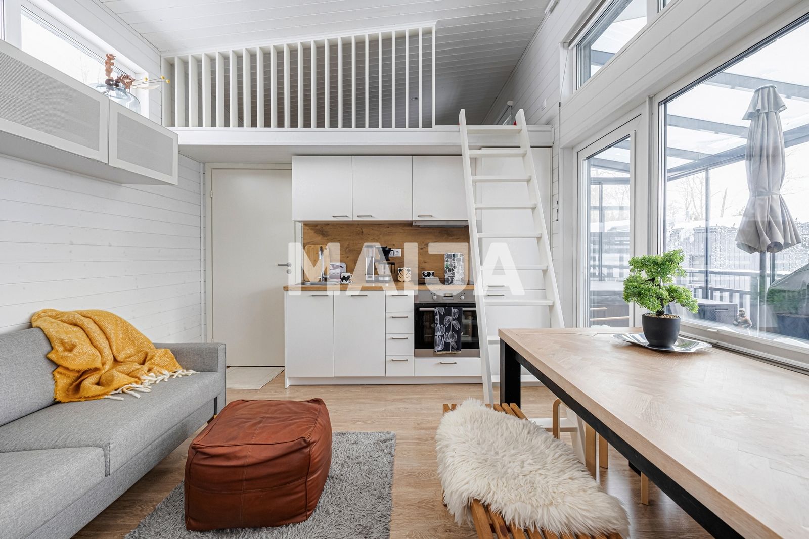 La villa también es ideal para el trabajo remoto en un ambiente tranquilo. La vida cotidiana y el ocio se combinan especialmente con una amplia terraza acristalada de 32 m2, que sirve como zona de estar y comedor de primavera a otoño.