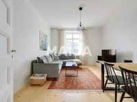 Luminoso y atmosférico apartamento en el prestigioso barrio Gripenberg en Mannerheimintie. La casa combina las mejores características de la vida urbana clásica: hermosos suelos de tabla, techos altos, grandes ventanas y amplios sills de ventana crean un conjunto espacioso y atemporal.