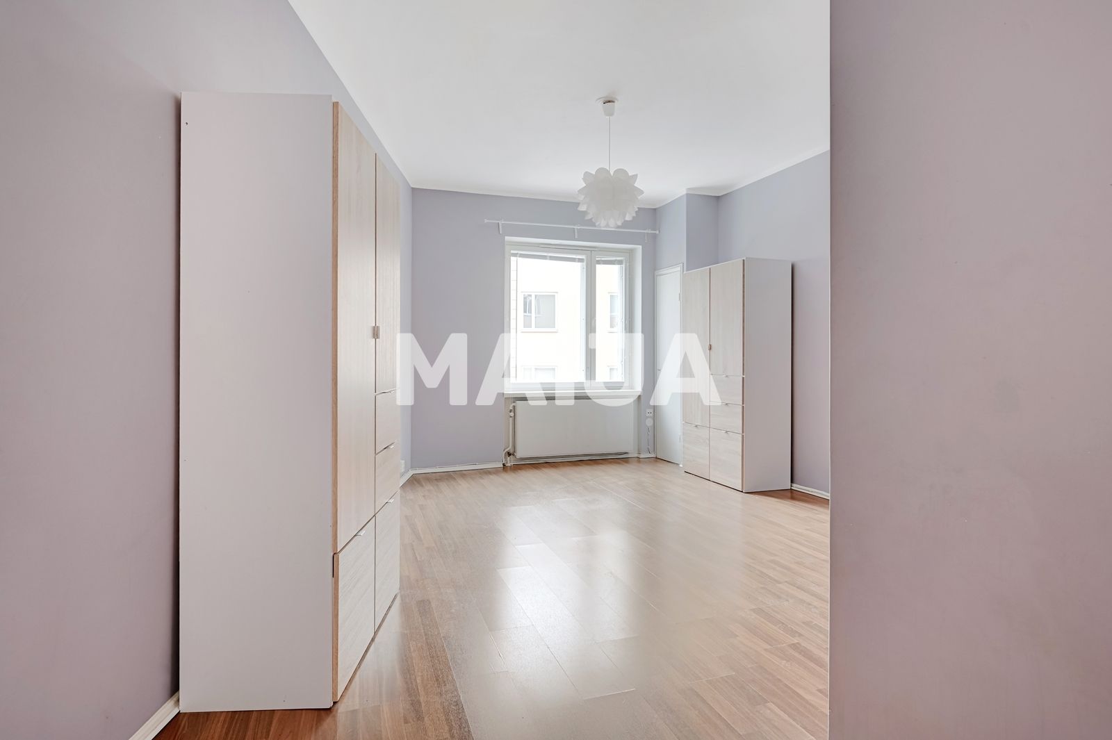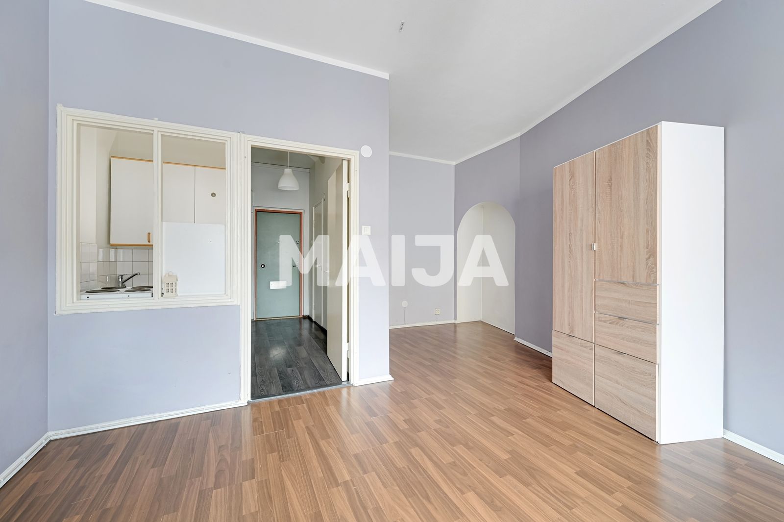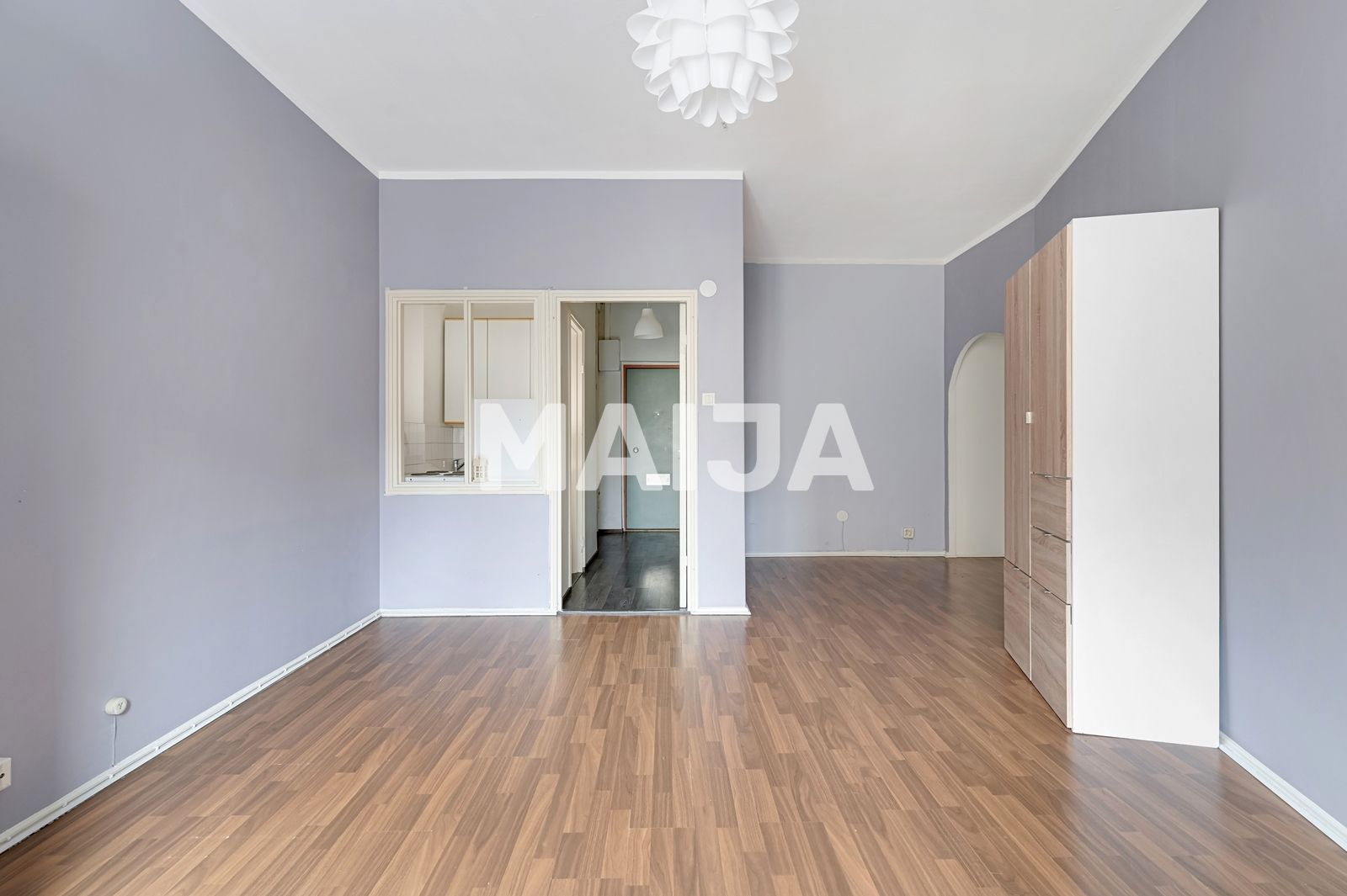 La zona de estar tiene vistas al patio. El baño está en muy buen estado y también puede acomodar una lavadora. La cocina tiene una ventana interior original que respira el espíritu de Kallio, pero si lo desea, el espacio puede ser renovado en una elegante cocina abierta.