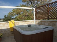 El dormitorio principal ofrece acceso a una terraza de 20 m2, donde se ha instalado el segundo jacuzzi de la villa. Las vistas son impresionantes sobre las impresionantes montañas y el pueblo de Vamos.