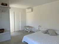 Downstairs es una cama doble grande en el dormitorio principal con walk-in closet y un baño muy grande con ducha y bañera, vistas al mar y la piscina.