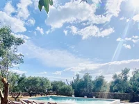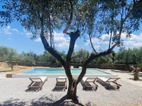 Rodeado de olivos, la propiedad incluye hermosos patios pavimentados, zonas de comedor al aire libre a la sombra, y una moderna piscina privada con vistas panorámicas tanto al mar como a las montañas. El aparcamiento al aire libre está disponible en el hotel.