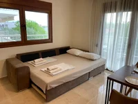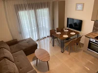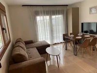 : first-floor apartment with a total net area of 44 m² and a 16.5 m² balcony. The property is newly built (2023) and fully furnished with new, modern furniture.
