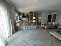 The apartment includes two luxurious, fully renovated bathrooms, made with high-quality materials such as marble and glass, and features a shower cabin and modern bathroom furniture. The flooring throughout the apartment is finished with high-quality tiles that mimic the texture of wood, adding a warm and modern feel.