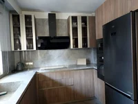 The apartment features three spacious bedrooms with built-in, modern wardrobes of high aesthetic value, offering ample storage space and clean lines. The kitchen is fully equipped with high-quality electrical appliances and contemporary cabinetry, combining wood and glass elements, while granite surfaces enhance both the functionality and elegance of the space. The living and dining area is open-plan, with excellent natural lighting from the large windows and balcony doors that lead to a spacious balcony with an open view of greenery, offering a sense of tranquility and well-being.
