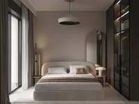 En la primera planta, el apartamento dispone de dos luminosos dormitorios con amplios armarios, mobiliario ergonómico y un diseño minimalista refinado, además de un baño completamente equipado con ducha, lavabo suspendido y espejo redondo.