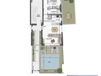 La vivienda ofrece una superficie interior neta total de 87,7 m2, con dos dormitorios, incluyendo un dormitorio principal, y dos baños modernos. Se complementa con un jardín privado de aproximadamente 90 m2 y una piscina privada de alrededor de 14-15 m2, mientras que el aparcamiento y un espacio de almacenamiento a nivel del sótano están incluidos en la propiedad.