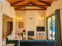 La sala de estar, el comedor y la cocina son parte de un plan abierto. La sala de estar se abre a una gran terraza cubierta. En la sala de estar también hay una chimenea.