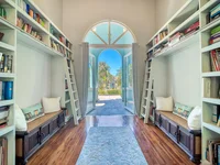 Esta casa cuenta con el vestíbulo con techos de 20 pies, construidos en librerías con escaleras, ventanas de vidrio, suelos de madera de caoba por todas partes, y medio baño y armario con almacenamiento, acondicionadores de aire y ventiladores por todas partes.