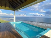 Casa frente al mar con 84ft/26m de fachada del Caribe que ofrece una independencia energética completa y unos costes operativos ultrabajos, con un promedio de sólo $32/mes en consumo de energía. Los 20 paneles funcionan tanto el 1,460sqft/136m2 principal 2 cama / 2 baño casa de huéspedes de 400sqft/37m2 apartamento estudio.