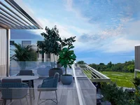 Sunset view and rice fields with a large panorama. Additional access to a private garden and parking for electric bikes from an additional panoramic window of the bedroom. Smart gen plan with common areas (coworking, swimming pool, sports areas, recreation areas, children's area)