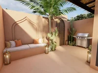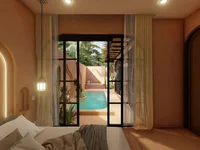 The room has direct access to both the swimming pool and bathroom, and the same concept for the living room, which is why the L shape is the best and smartest design for this type of villa! The swimming pool and vegetation with the 5.5m large vegetated wall above the pool are the centre point of the villa. Thanks to the large sliding bay windows overlooking the pool and garden, the living room benefits from abundant light. The simple, refined design, yet original thanks to the decoration and furniture makes for the perfect Instagram pictures.