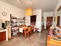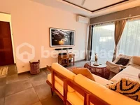 The villa showcases a modern tropical design with warm interiors and natural textures. Both bedrooms are well-appointed with air conditioning, en-suite bathrooms, and tasteful décor that blends earthy tones with contemporary finishes. The enclosed living room provides a welcoming atmosphere, featuring large windows that allow plenty of natural light, while the fully equipped kitchen and dining area are designed for practicality and style. Subtle decorative elements, from woven details to art pieces, add personality to the space, creating a home that feels elegant yet relaxed.