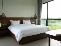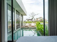 Completed in 2025, the villa is fully furnished and move-in ready, ideal for immediate occupancy or rental. Its clean, minimalist lines and natural materials evoke contemporary tropical living, with interiors flooded with light and views over the swimming pool and surrounding ricefields. Large sliding glass doors and expansive windows frame the west-south aspect, ensuring the home stays bright and welcoming throughout the day.
