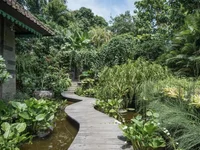 Visitors to this majestic property are in awe of the breathtaking panoramic views of an ancient river, framed by towering bamboos and the greenery of giant leafed tropical plants. The property consists of 2 pieces of land on either side of this river coursing through 5 metre walls of aged paras stone, the two sides connected by a romantic 12-metre bridge featuring steel art deco railings and carved columns. With a bridge view of tumbling rapids on one side, the other sees the river spreading out into a lazy crawl, creating relaxing water sounds with no signs of trash on the riverbed.