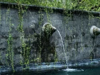 The impressive teak and bronze studded entrance doors mark the beginning of a journey into this amazing property passing a 30-metre spring water swimming pool, adorned with carved fountainheads reminiscent of Tirta Empul Temple. Two stone lions guard a curving walkway flanked either side by water-lily ponds. Going down the 42 hand-carved steps will take you to an open veranda which seamlessly transitions into the natural landscape.