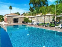 La villa está rodeada de un gran jardín de 1140 metros cuadrados con una zona verde, donde hay una terraza adyacente a una piscina adoquinada con tumbonas y sombrillas, un comedor equipado con una cocina de verano. El territorio de la villa está cercado, la entrada al territorio es a través de una puerta eléctrica.