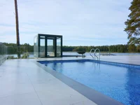 - 1st floor - entrance hall, living room combined with a dining area and kitchen, panoramic windows overlooking the lake, two bedrooms with their own bathrooms, a bathroom, an utility room and a hairdresser's, a swimming pool, a toilet