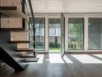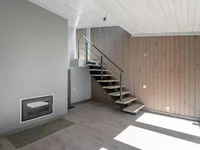 - La zona de la casa es de 46 metros cuadrados. - Las habitaciones están ubicadas en dos plantas: la cocina en la primera planta, la habitación de invitados y el baño, y el segundo dormitorio con balcón.