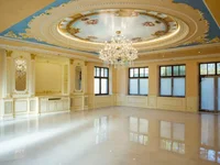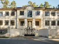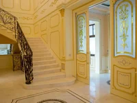 Para la construcción y la decoración de la casa, los materiales de la calidad más alta se usaron (madera natural, oro, pintura mural veneciana, vidrio de color, varios elementos decorativos, arañas de luces caras, escalera chic). Al mismo tiempo, el chalet tiene una disposición muy cómoda: - en el sótano hay varios cuartos técnicos (salas de calderas, filtros para la purificación del agua, etc.), así como un garaje espacioso, que puede rellenar hasta 10 coches;