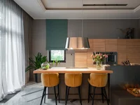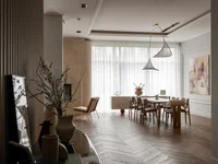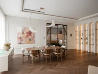 Comedor: Mesa de comedor Oku de Norr11 y la silla de Hippo y Elefante de Norr11 Consola con patas de acento y araña de acento; Perchero incorporado con estantes hechos de travertino natural; Las puertas de madera están hechas para ordenar.