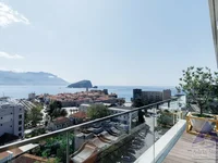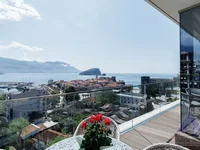 Una gran terraza con vistas directas al mar y al puerto deportivo de Budva.