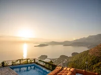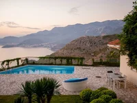La gran propiedad de 367 m ² incluye un jardín decorativo de estilo provenzal en dos niveles y una piscina con vistas al mar Adriático y a toda la Riviera de Budva.