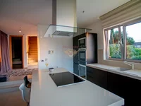 También en el primer piso hay una espaciosa cocina, equipada con electrodomésticos Simens, nevera para vino, muebles hechos de materiales de madera natural de alta calidad, así como encimera de cocina e isla de piedra natural. También hay una acogedora sala de estar y un comedor. Es espacioso y luminoso gracias a las ventanas en ambos lados que dejan pasar la luz del día en cualquier momento del día.