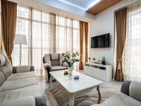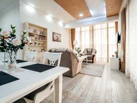 El apartamento está situado en la 5ª planta y tiene una superficie de 75 m2. El apartamento consta de un amplio salón con cocina, dos dormitorios, un baño y una terraza con vistas a la ciudad, las montañas y el mar.