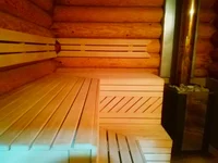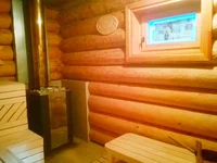 Una casa de juegos con cine, una mesa de tenis con acceso al jardín y a la piscina, un baño de madera de un bar con estufa de madera.