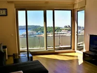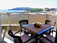 The apartment has a living room with a kitchen area, two separate bedrooms, two bathrooms and a balcony with a magnificent sea view.