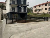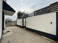 La parcela está cercada con una valla de piedra y hormigón, el patio está forrado con baldosas.