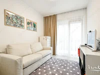 El apartamento consta de un amplio salón combinado con cocina y comedor, 3 dormitorios (o dos dormitorios y una oficina), 2 baños, una amplia terraza con vistas parciales al mar y un gran patio privado con impresionantes vistas al mar. Lovcen. La zona interior del apartamento es de 92 m2, la terraza es de 18 m2, la zona privada del patio es de 65 m2. El apartamento está totalmente amueblado y equipado con modernos electrodomésticos de alta calidad. El edificio está equipado con videovigilancia y un sistema de intercomunicación. El apartamento tiene aire acondicionado y calefacción por suelo radiante. También hay una plaza de aparcamiento y un trastero en el estacionamiento subterráneo.