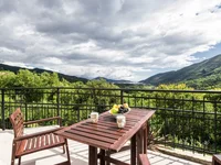Las ventanas y la terraza ofrecen una hermosa vista del mar y las montañas.
