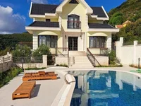 Venta Markovici No2600. Villa en venta en el pueblo de Markovici, a 10 minutos en coche de Budva. La villa tiene 3 plantas, un garaje para 3 coches, barbacoa, piscina. Vista al mar. Utilidad, cocina de verano. La casa tiene 4 dormitorios, 4 baños, un gran salón.