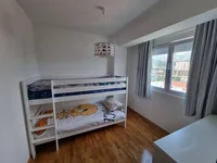 📌 Estructura: dos dormitorios (una cama doble, la otra guardería con cama litera), salón con ventanas panorámicas, con vistas al mar y la ciudad, cocina, baño con cabina de ducha