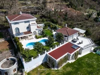 Villa de lujo con una superficie total de 410 m2, situada en una parcela de 1.300 m2, con vistas al mar abierto y un alto nivel de privacidad. La villa consta de 5 dormitorios y 4 baños, junto con armarios adicionales (2 walk-in closets separados más uno en el dormitorio principal), así como armarios empotrados en todas las habitaciones. El interior está totalmente amueblado, con suelos de mármol y escaleras, y está listo para ocupación inmediata sin inversión adicional. La propiedad también incluye un pabellón de 70 m2 con terraza abierta, así como una piscina privada, ideal para vivir al aire libre. Además, hay una casa separada de 70 m2 en la parcela que se puede utilizar para los huéspedes o el personal (dormitorio, salón, cocina y baño). La villa cuenta con tres garajes con una capacidad total para seis vehículos, así como un gimnasio privado. El sistema de calefacción se combina e incluye calefacción por suelo radiante y chimenea, soportada por una sala de calderas con una caldera de pellets, caldera eléctrica, calentador de agua, paneles solares y una bomba de calor, garantizando eficiencia energética y comodidad durante todo el año. La propiedad también tiene dos pozos privados, y el patio está ajardinado con árboles frutales.