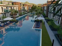 El complejo, construido sobre 14.000 m2 de terreno, consta de 14 bloques de dos plantas, apartamentos y casas. Incluye una entrada segura al complejo con barrera, bar en la piscina, piscina al aire libre, piscina para niños, parque infantil y zona de aparcamiento para cada apartamento.