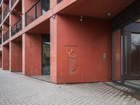 La fachada está hecha de hormigón coloreado con un relieve de la Sirena de Varsovia por David Rygier.