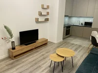 The apartment is fully furnished and consists of a hall, a bathroom with a bathtub and a toilet, a bedroom, a living room, a kitchenette and a terrace (loggia) 12.7 m2.