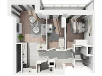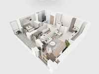 This spacious three-room apartment on the 8th floor perfectly combines comfort and style. The entrance halls of the house are decorated with decorative structural colors, the floors are lined with tiles in the style of terrazzo, and muffled lighting creates an elegant atmosphere at the entrance to each apartment. The entrance areas are released with varnished metal in elegant champagne color and an individually designed pattern on architectural concrete.