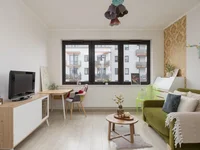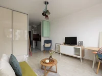 En el apartamento: una sala con zona de cocina (4,64 m2), un amplio salón (17,28 m2) y un baño (3,70 m2). El estudio está en excelente estado, con renovación moderna y muebles incorporados. La cocina está equipada con electrodomésticos: estufa, nevera, lavavajillas, microondas. El baño tiene ducha, lavabo y lavadora.