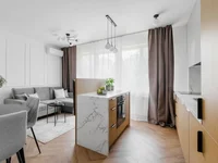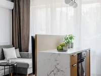 El apartamento ha actualizado completamente todos los sistemas y nuevos electrodomésticos sin usar y muebles hechos a medida. El apartamento consta de un amplio salón con cocina americana y salida a un gran balcón, un dormitorio, una habitación adicional, un pasillo y un baño. También hay un trastero.