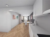 El apartamento está situado en el territorio del complejo Latawiec, construido en 1953-1955. El diseño incluye un amplio salón con alcoba, un salón con cocina americana, un amplio dormitorio con vestidor y un baño con aseo. Las ventanas dan al patio, que garantiza la paz y la tranquilidad.