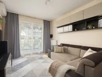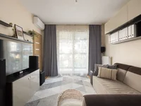 El apartamento está en buen estado, con acabado de alta calidad y un diseño conveniente. El salón tiene aire acondicionado LG (2018). La cocina tiene electrodomésticos incorporados, incluyendo un refrigerador Samsung, un microondas Sharp, una estufa eléctrica, un horno, un lavavajillas y una campana Beko. El baño tiene bañera, lavabo, aseo y lavadora.